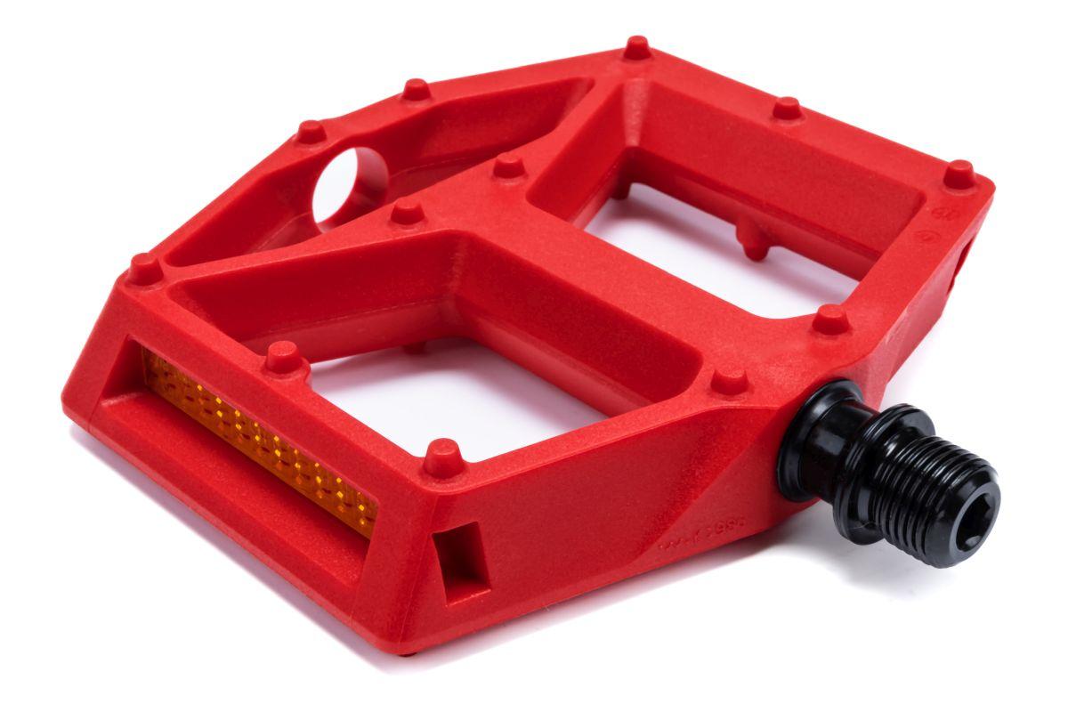 leichtes Flat-Pedal, Nylon-verstärkter-Kunststoff-Körper und CrMo Achse, angefaste Kanten für erhöhte Bodenfreiheit in Kurven, große Standfläche, flache Bauweise, zwölf Pins pro Seite, LSL-Bushing, integrierte Reflektoren
