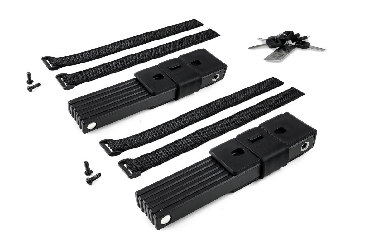 Das ACID RIGID 100 Pure TWIN PACK beinhaltet zwei Faltschlösser, zwei Halter sowie sechs gleichschließende Schlüssel. Die hochsicheren Faltschlösser sind aus speziell gehärtetem rostfreien Hochleistungsstahl gefertigt und genügen durch die ART1 Zertifizierung allerhöchsten Ansprüchen. Ein solider, gefederter Bolzen sorgt sowohl für eine sehr einfache Handhabung als auch für sicheres Verschließen. Durch das schlichte und schlanke Design ist das gewichtsoptimierte 100 cm lange Faltschloss nicht nur handgerecht und griffig, sondern passt nahezu an jedes