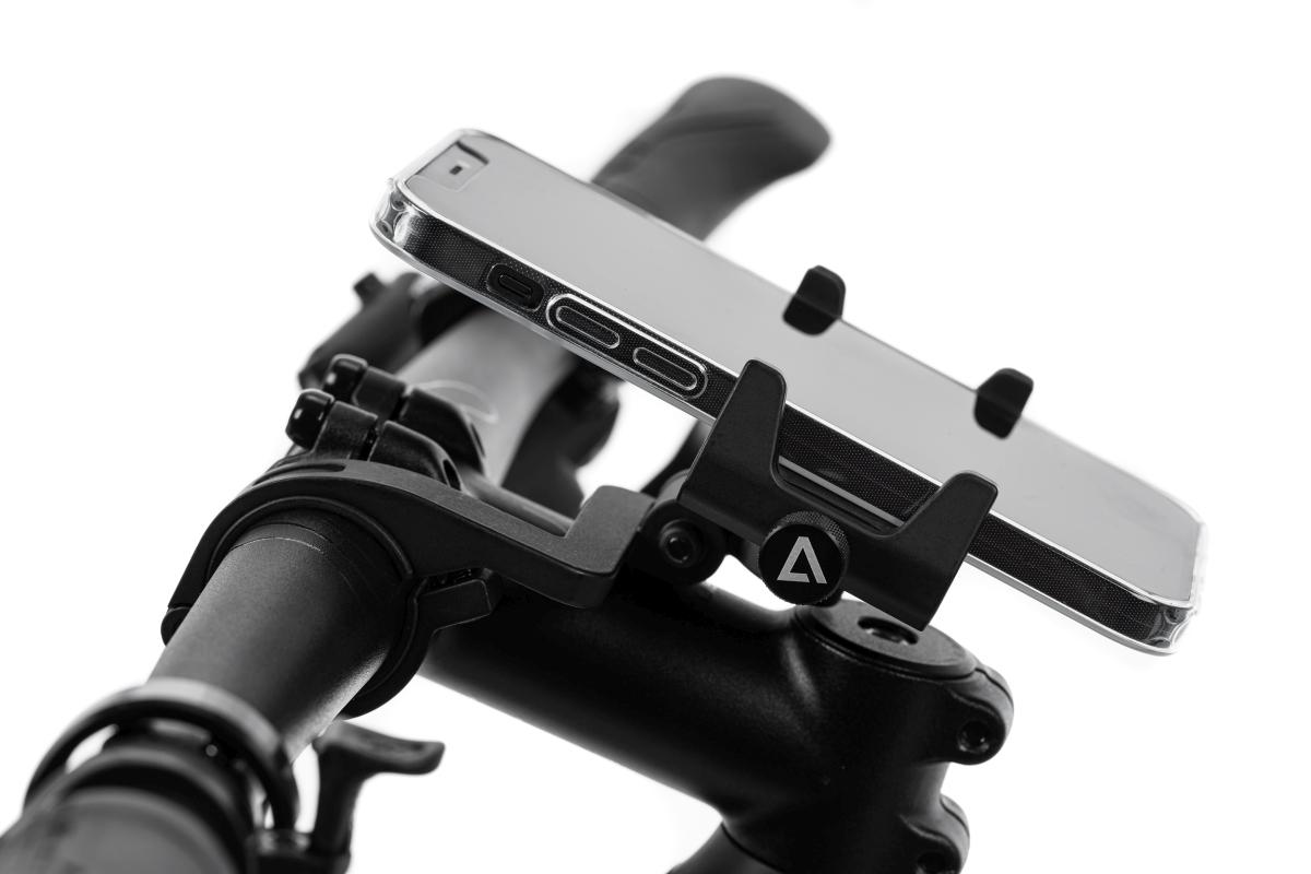 Variabel verstellbare Handyhalterung, für Breiten von 67-82mm, max. Handyhöhe: 14cm, 360° drehbar, Längsposition stufenlos verstellbar, Winkel verstellbar, Handy mittig auf dem Vorbau, fester Halt durch Silikonpads