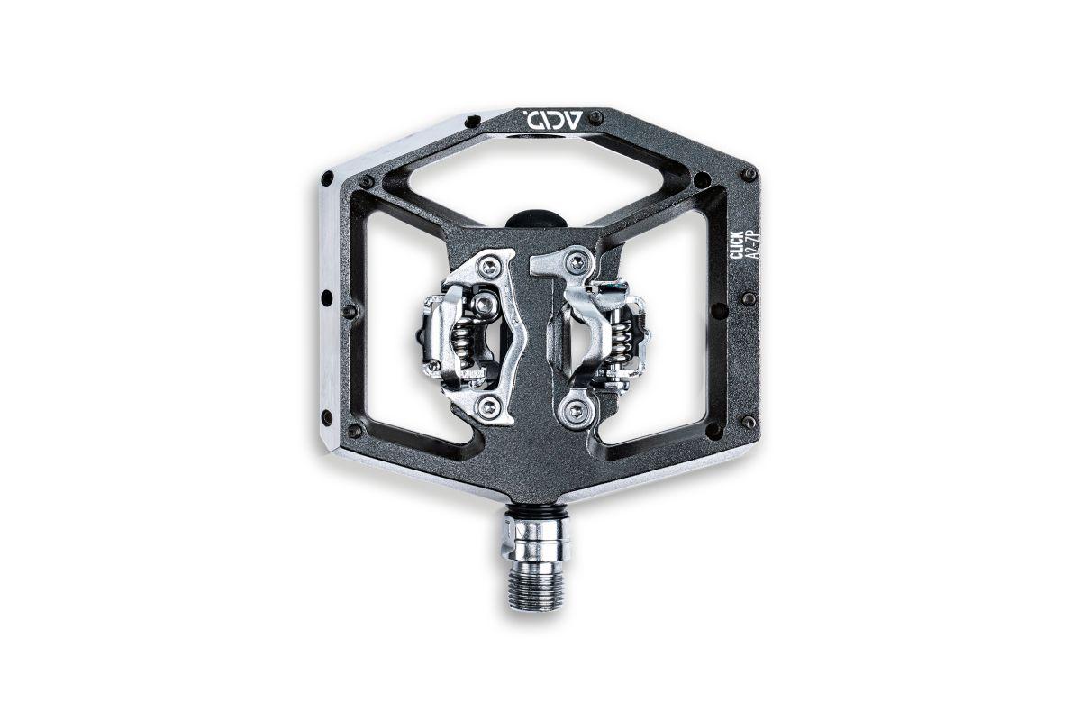 Click Flat-Pedal mit beidseitigem Klick-System, SPD-kompatibel, CNC-veredelter Aluminiumkörper und CrMo Achse, angefaste Kanten für erhöhte Bodenfreiheit in Kurven, große Standfläche, extrem flache Bauweise, 16 austauschbare und einstellbare Pins, gedichtete Industrielager