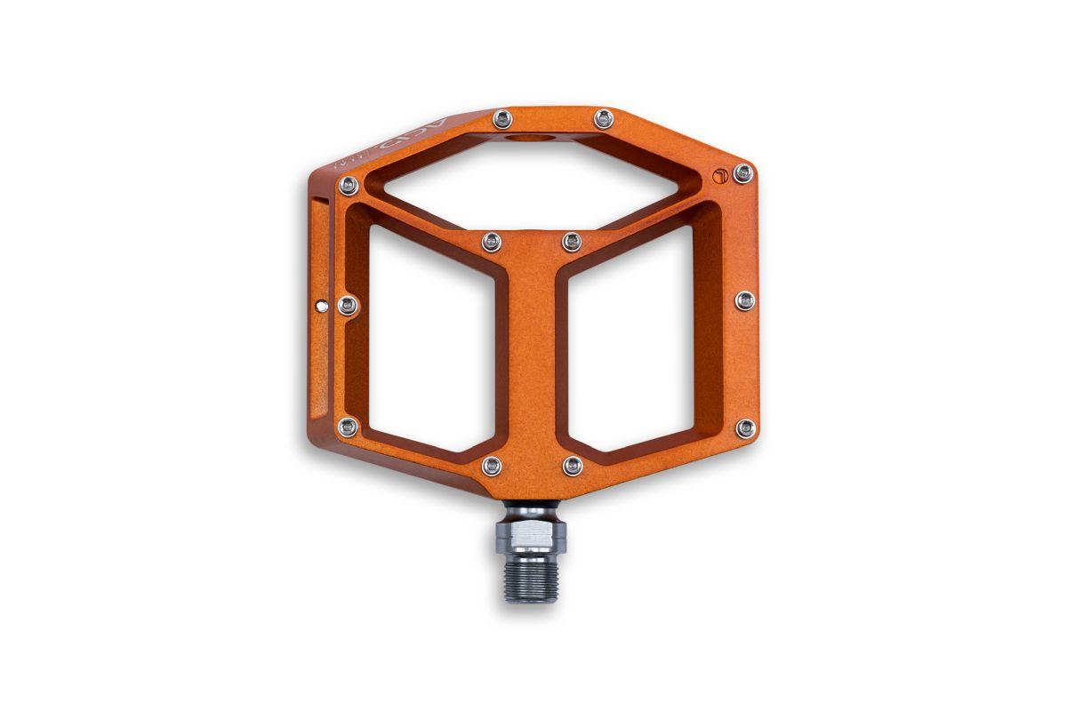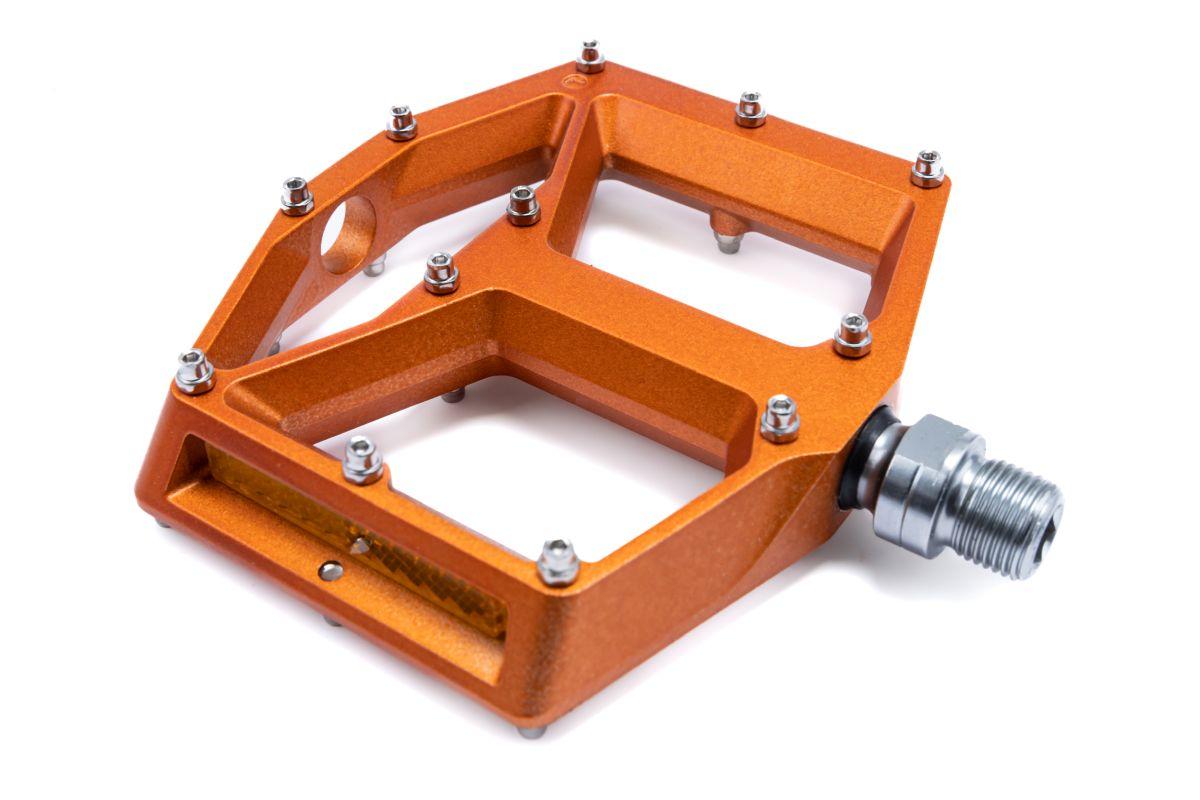 leichtes Flat-Pedal, Aluminiumkörper und CrMo Achse, angefaste Kanten für erhöhte Bodenfreiheit in Kurven, große Standfläche, flache Bauweise, zwölf Pins pro Seite, LSL-Bushing, integrierte Reflektoren