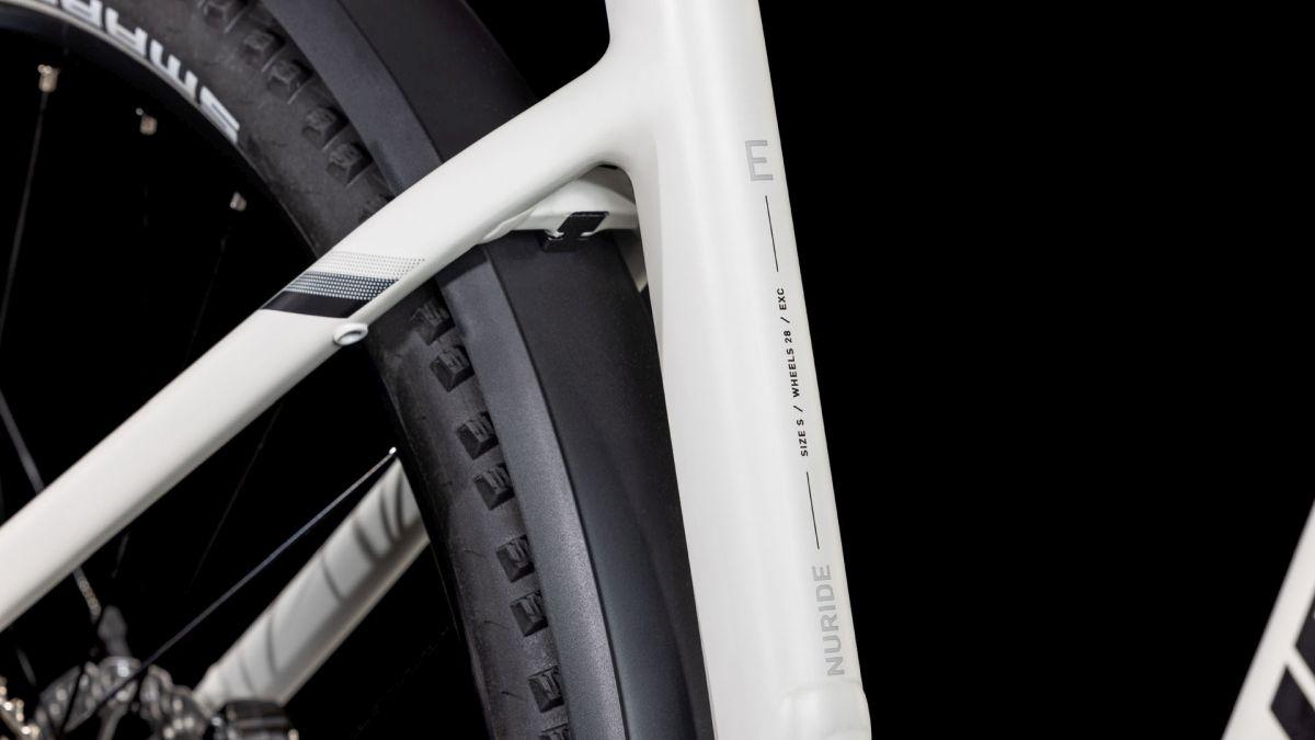 Der Tiefeinsteiger-Rahmen des Nuride Hybrid hält, was sein Name verspricht – einfaches, unkompliziertes Auf- und Absteigen sind damit garantiert. Doch da ist noch mehr: Neben einer Federgabel mit 100 mm Federweg für ein Plus an Fahrkomfort und Kontrolle haben wir das Chassis mit großzügiger Reifenfreiheit (sogar inklusive der mitgelieferten Schutzbleche) ausgestattet. Im Inneren verlaufende Züge unterstreichen die cleane Optik des Rahmens und verursachen kaum Wartungsaufwand. Ebenso harmonisch ins Design integriert sind der Bosch CX Antrieb und der 800 Wh starke PowerTube Akku. Außerdem gibt's einen Kettenschutz sowie ein UDH für einfachere Ersatzteilverfügbarkeit. Was noch? Serienmäßig verbaute Schutzbleche, Lichter und ein Seitenständer. Da kann das nächste Touren-Abenteuer kommen!