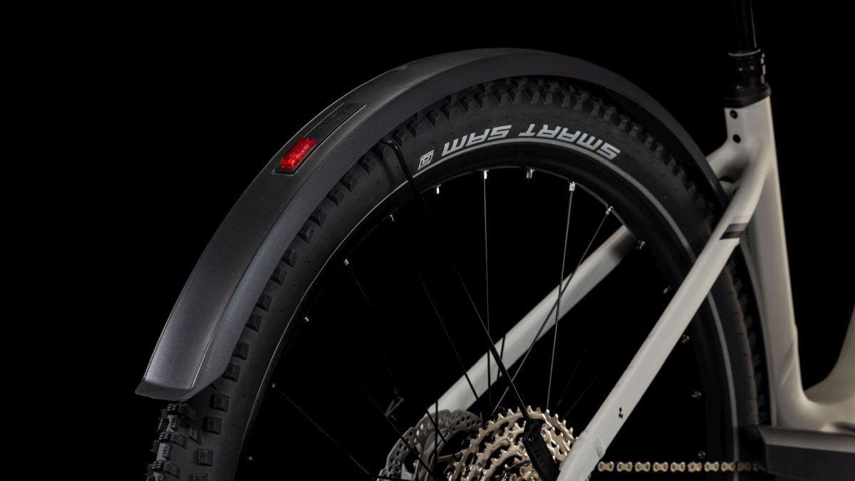 Der Tiefeinsteiger-Rahmen des Nuride Hybrid hält, was sein Name verspricht – einfaches, unkompliziertes Auf- und Absteigen sind damit garantiert. Doch da ist noch mehr: Neben einer Federgabel mit 100 mm Federweg für ein Plus an Fahrkomfort und Kontrolle haben wir das Chassis mit großzügiger Reifenfreiheit (sogar inklusive der mitgelieferten Schutzbleche) ausgestattet. Im Inneren verlaufende Züge unterstreichen die cleane Optik des Rahmens und verursachen kaum Wartungsaufwand. Ebenso harmonisch ins Design integriert sind der Bosch CX Antrieb und der 800 Wh starke PowerTube Akku. Außerdem gibt's einen Kettenschutz sowie ein UDH für einfachere Ersatzteilverfügbarkeit. Was noch? Serienmäßig verbaute Schutzbleche, Lichter und ein Seitenständer. Da kann das nächste Touren-Abenteuer kommen!