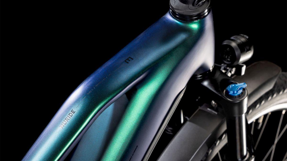 Auf den ersten Blick sieht der Nuride Hybrid Trapezrahmen vielleicht unspektakulär aus, doch wer genau schaut, wird von seiner subtilen Eleganz und seinen innovativen Details begeistert sein. Neben einer Federgabel mit 100 mm Federweg für ein Plus an Fahrkomfort und Kontrolle haben wir das Chassis mit großzügiger Reifenfreiheit (sogar inklusive der mitgelieferten Schutzbleche) ausgestattet. Im Inneren verlaufende Züge unterstreichen die cleane Optik des Rahmens und verursachen kaum Wartungsaufwand. Ebenso harmonisch ins Design integriert sind der Bosch CX Antrieb und der 800 Wh starke PowerTube Akku. Außerdem gibt's einen Kettenschutz sowie ein UDH für einfachere Ersatzteilverfügbarkeit. Was noch? Serienmäßig verbaute Schutzbleche, Lichter und ein Seitenständer. Da kann das nächste Touren-Abenteuer kommen!