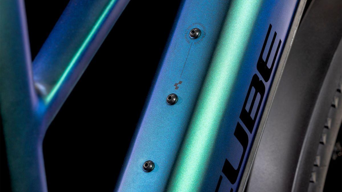Auf den ersten Blick sieht der Nuride Hybrid Trapezrahmen vielleicht unspektakulär aus, doch wer genau schaut, wird von seiner subtilen Eleganz und seinen innovativen Details begeistert sein. Neben einer Federgabel mit 100 mm Federweg für ein Plus an Fahrkomfort und Kontrolle haben wir das Chassis mit großzügiger Reifenfreiheit (sogar inklusive der mitgelieferten Schutzbleche) ausgestattet. Im Inneren verlaufende Züge unterstreichen die cleane Optik des Rahmens und verursachen kaum Wartungsaufwand. Ebenso harmonisch ins Design integriert sind der Bosch CX Antrieb und der 800 Wh starke PowerTube Akku. Außerdem gibt's einen Kettenschutz sowie ein UDH für einfachere Ersatzteilverfügbarkeit. Was noch? Serienmäßig verbaute Schutzbleche, Lichter und ein Seitenständer. Da kann das nächste Touren-Abenteuer kommen!