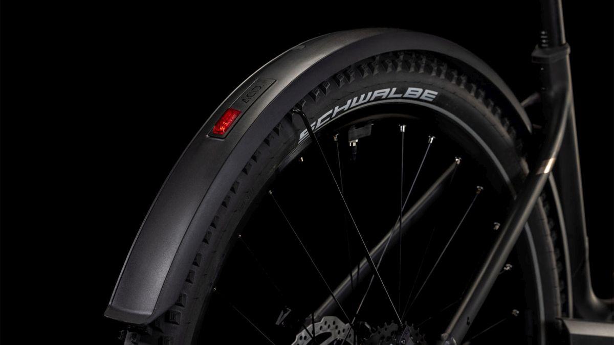 Der Tiefeinsteiger-Rahmen des Nuride Hybrid hält, was sein Name verspricht – einfaches, unkompliziertes Auf- und Absteigen sind damit garantiert. Doch da ist noch mehr: Neben einer Federgabel mit 100 mm Federweg für ein Plus an Fahrkomfort und Kontrolle haben wir das Chassis mit großzügiger Reifenfreiheit (sogar inklusive der mitgelieferten Schutzbleche) ausgestattet. Im Inneren verlaufende Züge unterstreichen die cleane Optik des Rahmens und verursachen kaum Wartungsaufwand. Ebenso harmonisch ins Design integriert sind der Bosch CX Antrieb und der 800 Wh starke PowerTube Akku. Außerdem gibt's einen Kettenschutz sowie ein UDH für einfachere Ersatzteilverfügbarkeit. Was noch? Serienmäßig verbaute Schutzbleche, Lichter und ein Seitenständer. Da kann das nächste Touren-Abenteuer kommen!