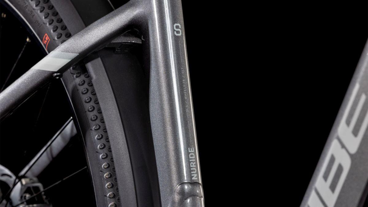 Der Tiefeinsteiger-Rahmen des Nuride Hybrid hält, was sein Name verspricht – einfaches, unkompliziertes Auf- und Absteigen sind damit garantiert. Doch da ist noch mehr: Neben einer Federgabel mit 100 mm Federweg für ein Plus an Fahrkomfort und Kontrolle haben wir das Chassis mit großzügiger Reifenfreiheit (sogar inklusive der mitgelieferten Schutzbleche) ausgestattet. Im Inneren verlaufende Züge unterstreichen die cleane Optik des Rahmens und verursachen kaum Wartungsaufwand. Ebenso harmonisch ins Design integriert sind der Bosch CX Antrieb und der 800 Wh starke PowerTube Akku. Außerdem gibt's einen Kettenschutz sowie ein UDH für einfachere Ersatzteilverfügbarkeit. Was noch? Serienmäßig verbaute Schutzbleche, Lichter und ein Seitenständer. Da kann das nächste Touren-Abenteuer kommen!