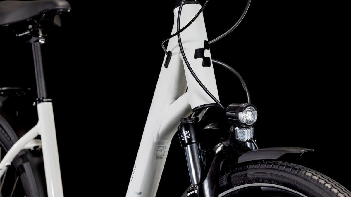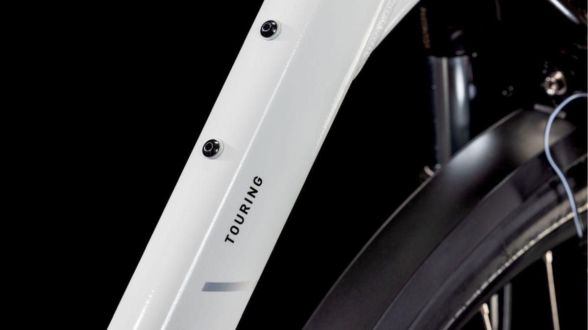 Das Herzstück des Touring ist sein hochwertiger, leichter, doppelt konifizierter Aluminium-Tiefeinsteigerrahmen, der – nomen est omen – das Auf- und Absteigen zum Kinderspiel und dank Efficient Comfort Geometry selbst die längsten Ausfahrten zum dauerhaften Genuss macht. Ein weiteres Highlight ist sein agiles, intuitives Handling. Die Züge haben wir für konstant präzise Gangwechsel und wenig Wartungaufwand sauber ins Unterrohr verlegt – dadurch geht's sorgenfrei und geschmeidig vorwärts. Dazu kommen ein stylisher semi-integrierter Gepäckträger, auf dem alles Platz findet, was auf Tour mit muss, und ein Flat Mount Seitenständer zum unkomplizierten Parken und Abstellen.