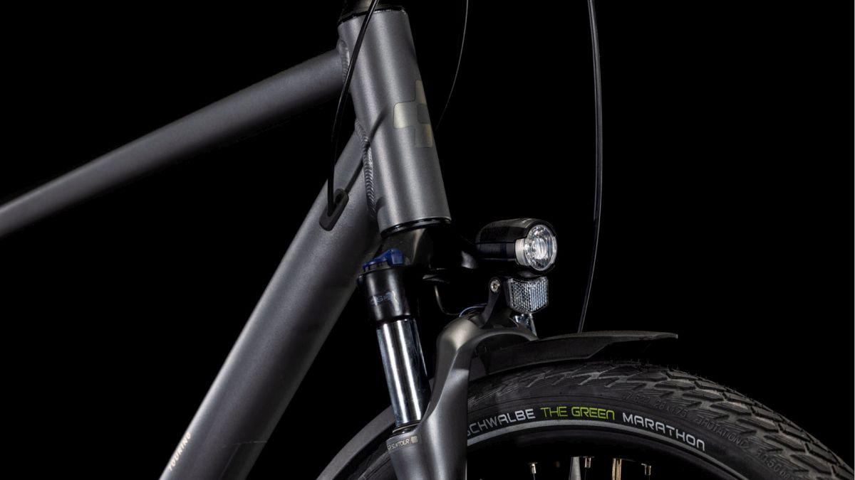 Warum wir unseren vielseitigen Tourer mit Scheibenbremsen versehen haben? Weil sie das Bike extrem sicher und zuverlässig verzögern – und zwar bei jedem Wetter und allen Bedingungen. Denn wer täglich mit dem Rad durch den Stadtverkehr ins Büro pendelt oder am Wochenende über Land unterwegs ist, wird genau das zu schätzen wissen. Ein weiterer Aspekt ist der Komfort: Dank der geschmeidigen Suntour Federgabel und der leichtgängigen Shimano Cues 2x9-fach Schaltung kommst du stets bequem und entspannt ans Ziel. Das umfangreiche Zubehörset umfasst eine dynamogespeiste Lichtanlage, Schutzbleche, einen Seitenständer und einen semi-integrierten Gepräckträger. Das Ergebnis: ein Bike, das für wirklich alles zu haben ist.