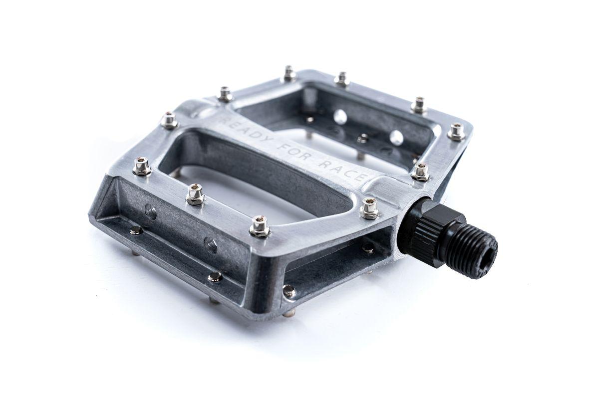 Die leichten Flat-Pedale sind aus Aluminium hergestellt und werden mit einer CrMo-Achse verbaut. Die Anti-Rutsch-Pins sind austauschbar und bieten besten Halt am Fahrrad.