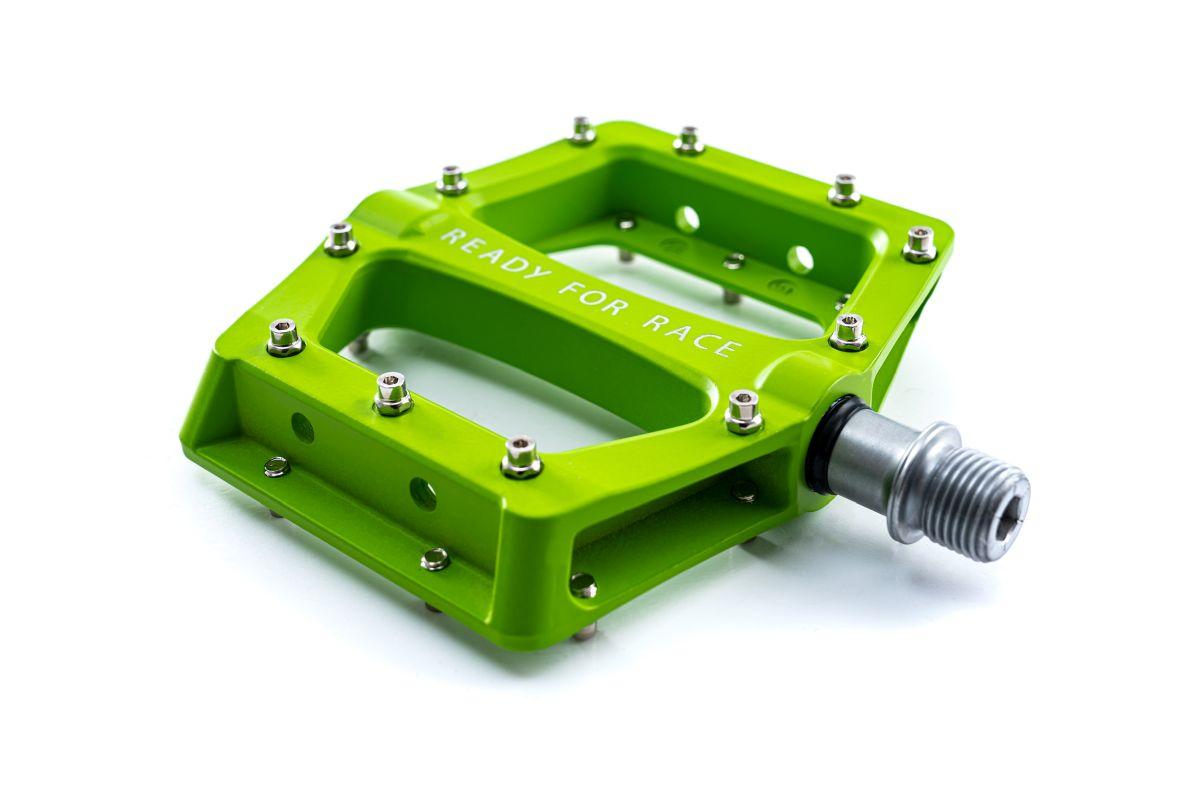 Die leichten Flat-Pedale sind aus Aluminium hergestellt und werden mit einer CrMo-Achse verbaut. Die Pedale werden mit hochwertigen Lagern gelagert. Die Anti-Rutsch-Pins sind austauschbar und bieten besten Halt am Fahrrad.