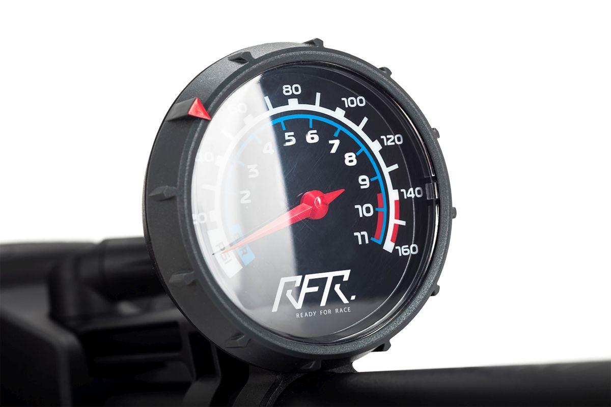 Presta- und Schrader-Ventilkopf mit Schnellverschlusshebel, Kunststofffuß mit integriertem Manomenter, 160 psi max. / 11 bar max.